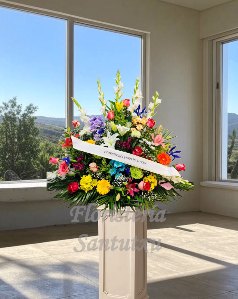 La corona funeraria Bilbao representa un homenaje solemne y lleno de simbolismo. Sus tonos rojos y blancos evocan amor eterno, respeto y devoción.