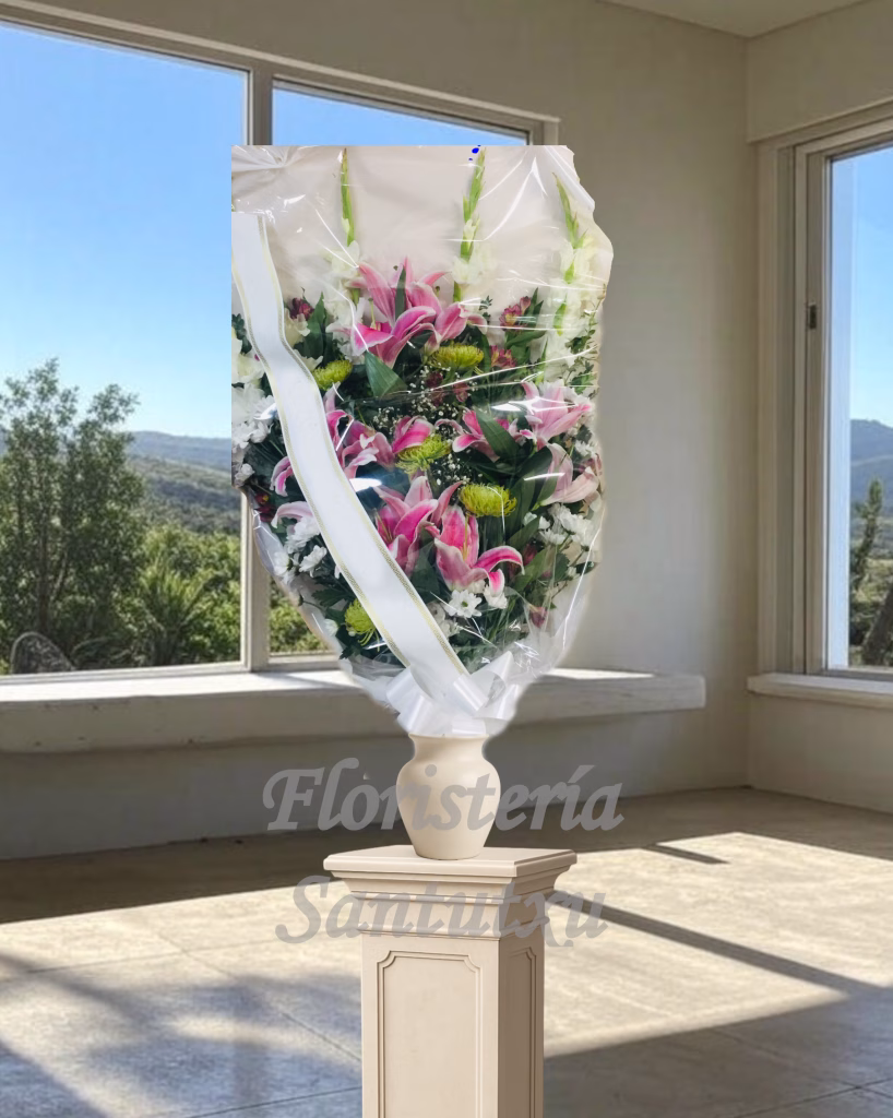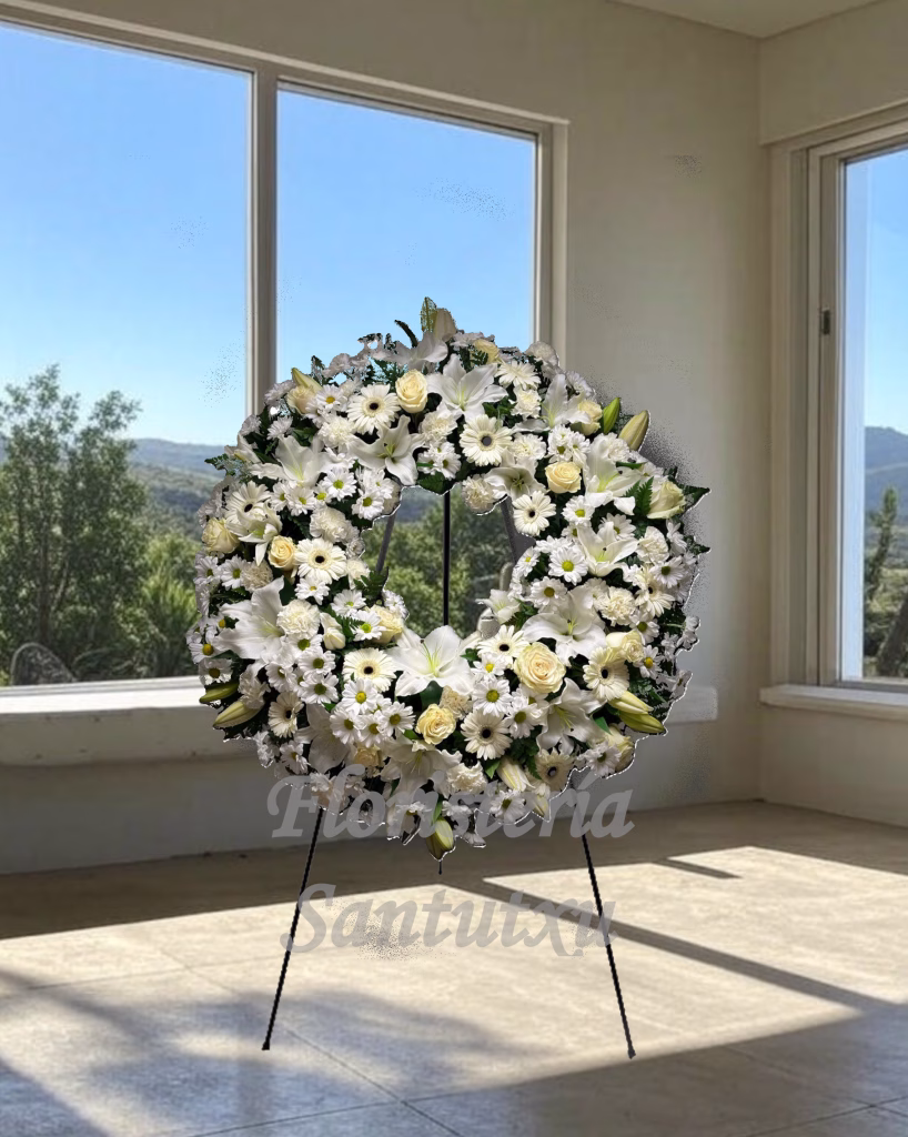 La corona funeraria Armintza es una creación solemne y armoniosa, símbolo de respeto y amor eterno. Su diseño en tonos blancos refleja paz y gratitud en la despedida.