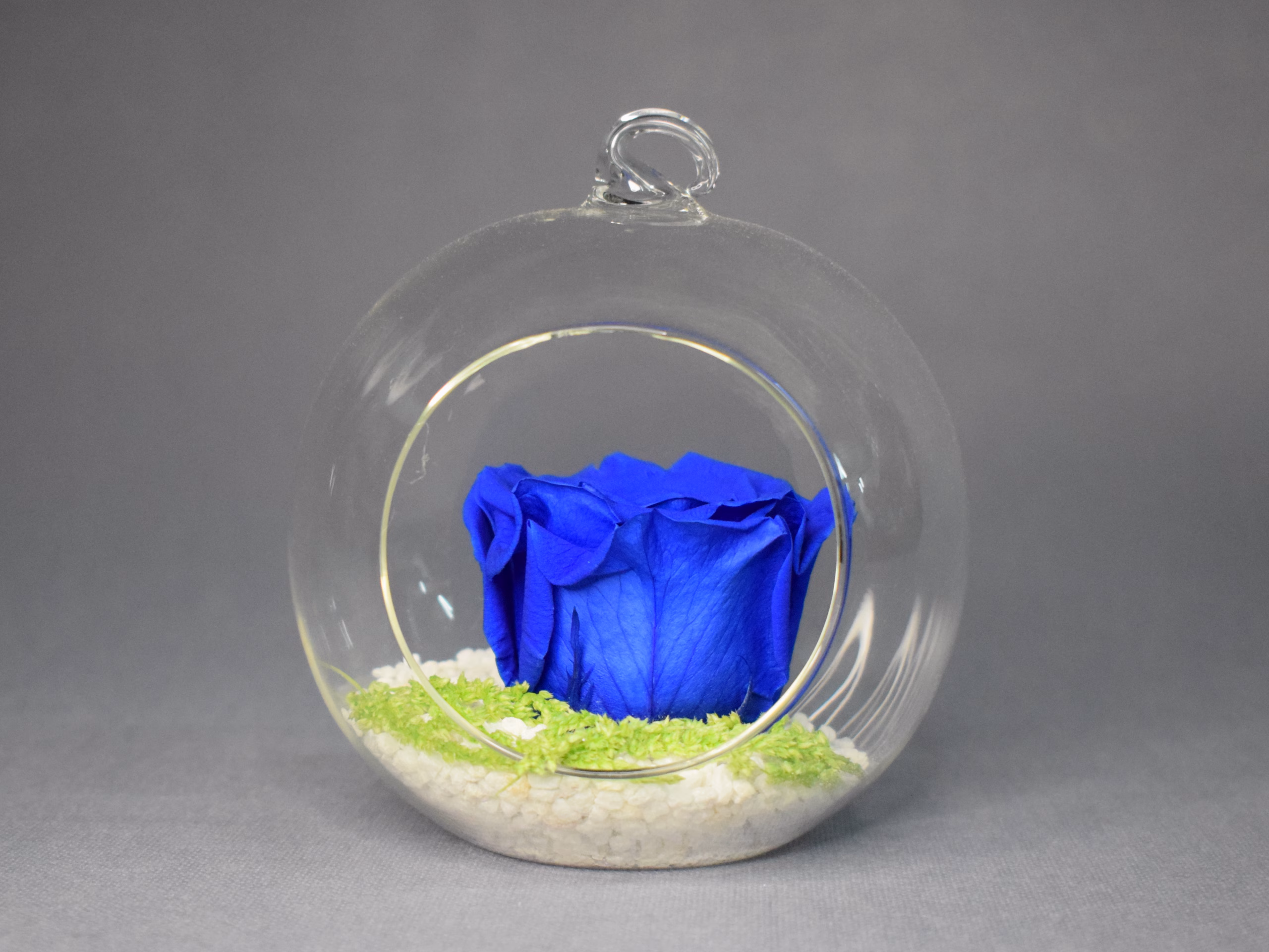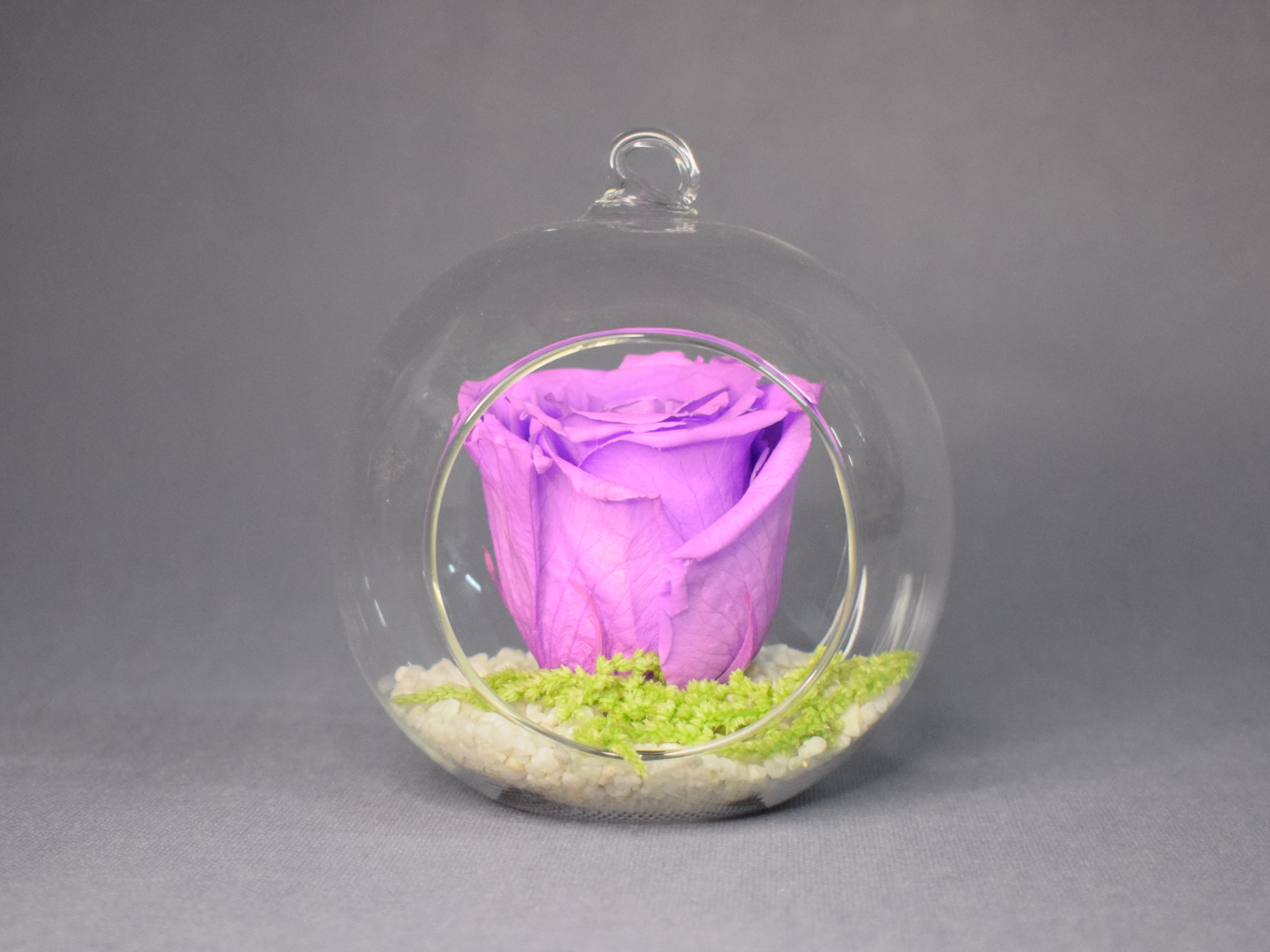 Este diseño encarna la perfección del detalle. La rosa preservada, rodeada por piedras claras y musgo verde, se eleva dentro de una esfera de cristal que simboliza la pureza y la eternidad.